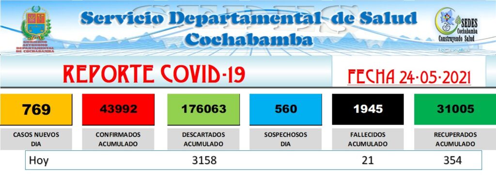 El Servicio Departamental de Salud (SEDES) reportó la cifra alta de 21 decesos en las últimas 24 horas en Cochabamba. Asimismo, se presentaron 769 contagios nuevos de coronavirus.