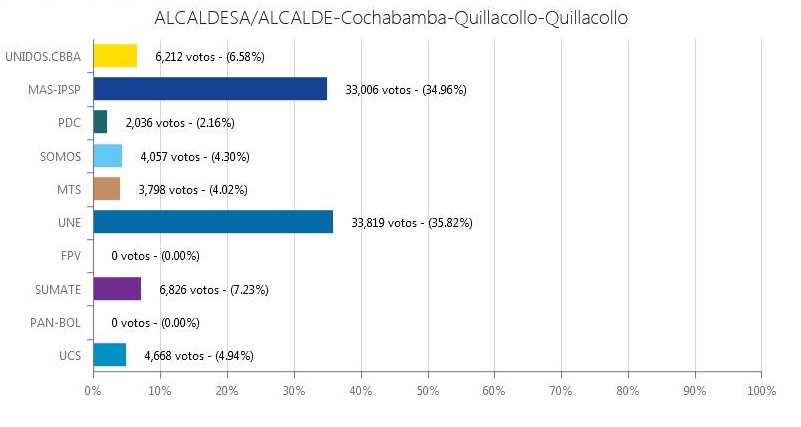 Héctor Cartagena, de Unidad Nacional de Esperanza (UNE), es el nuevo alcalde de Quillacollo. Al 100% de actas computadas por el Órgano Electoral Plurinacional (OEP), el candidato alcanzó el 35.82% de votación, mientras que Héctor Villarroel, del Movimiento Al Socialismo (MAS), llegó al 34.96%.