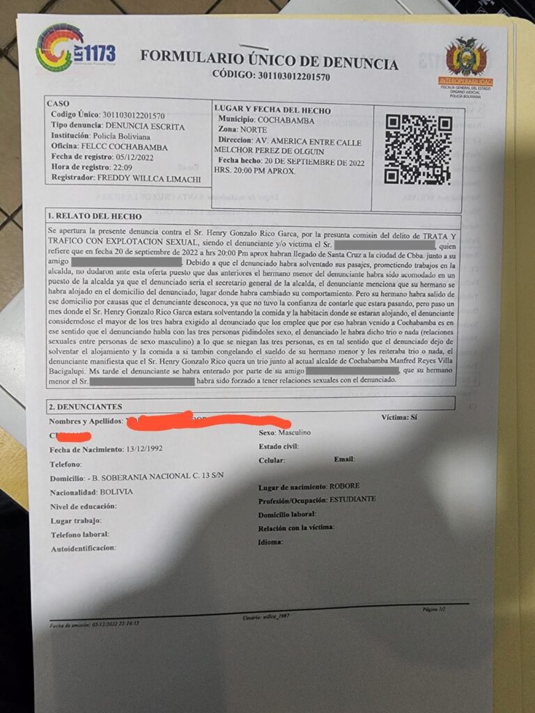 Tres jóvenes del oriente formalizaron una denuncia contra el Secretario General de la alcaldía de Cochabamba, Henry Rico, ante el ministerio público, por presunto abuso sexual y trata y tráfico de personas, señalando que fueron traídos a la llajta con promesas de trabajos en la alcaldía.