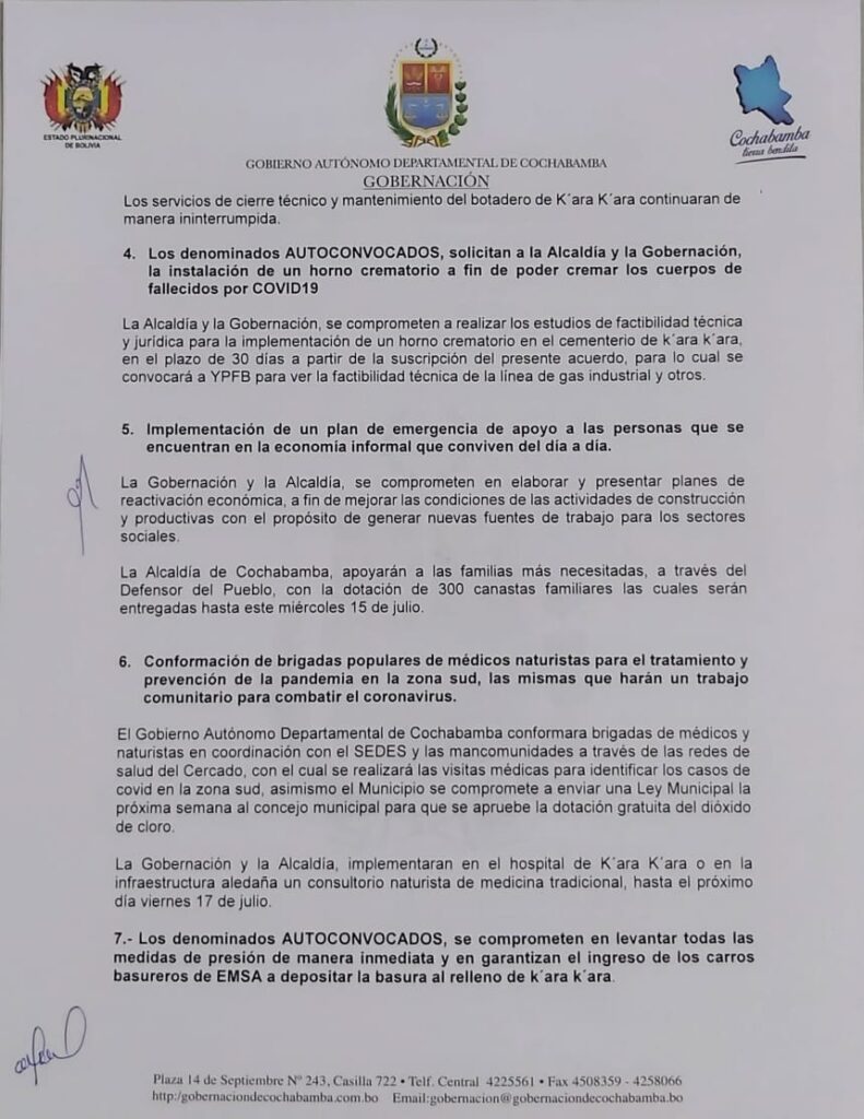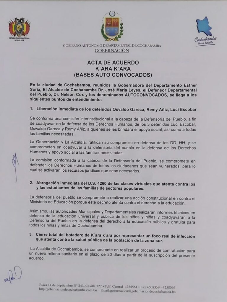 En lo referido al cierre total del botadero de K’ara K’ara, la alcaldía de Cochabamba se comprometió al cierre técnico paralelo a las gestiones que realizará de un proceso de contratación para un nuevo relleno sanitario, entre los principales puntos acordados.