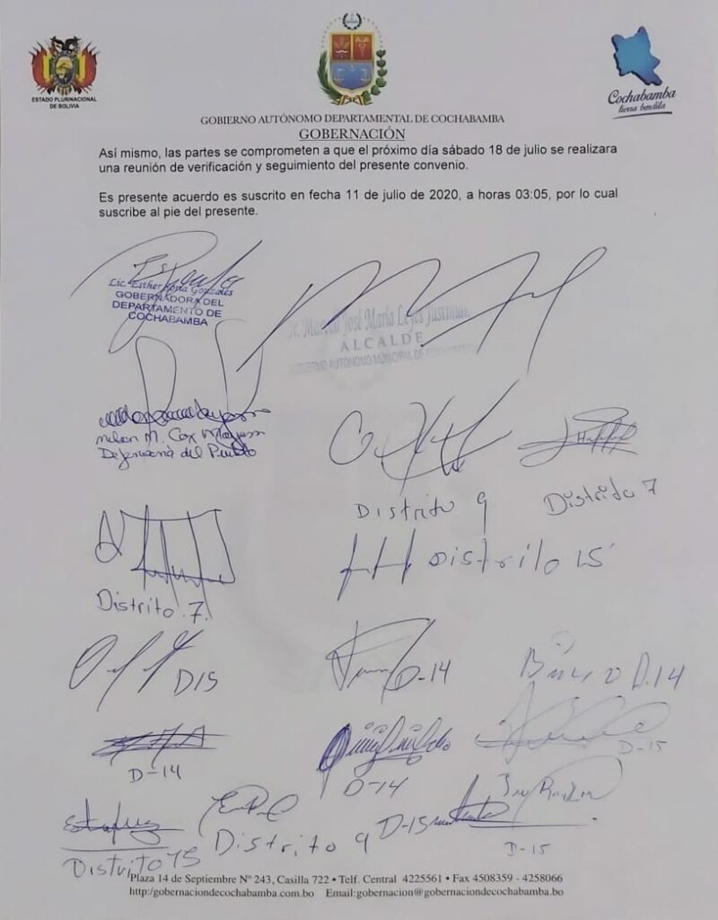 En la oportunidad tanto la Gobernación como la Alcaldía de Cochabamba, ratificaron en la mesa de diálogo, su compromiso por la defensa de los derechos humanos y asumieron coadyuvar a la Defensoría del Pueblo en la defensa de los derechos humanos y apoyo social a las familias necesitadas.