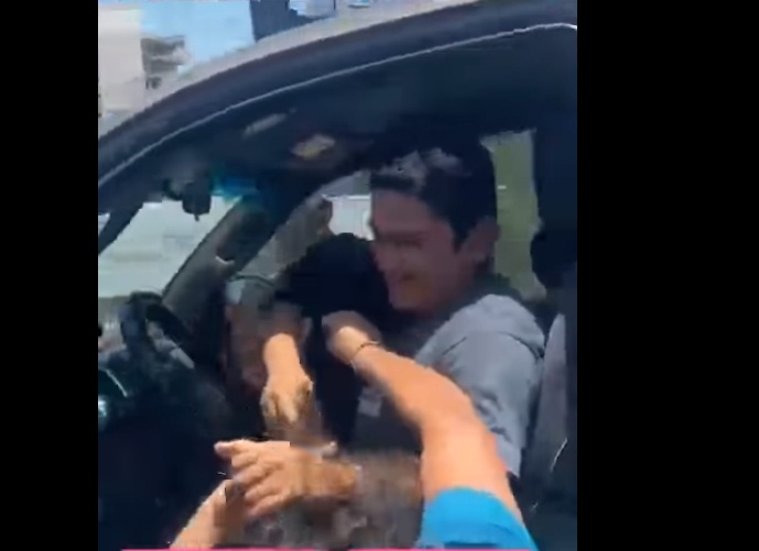 En el material se puede ver cuando una mujer confrontó a su esposo tras sorprenderlo con su amante. Testigos en el lugar refirieron que la esposa agarró de los cabellos y empezó a golpear la camioneta de su esposo, esto ante los ojos de los transeúntes.