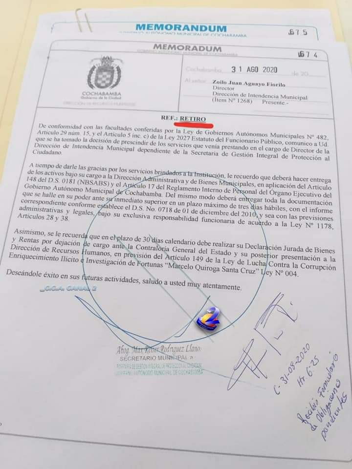 El secretario de Protección al Ciudadano del municipio, Max Rodriguez, firmó el memorándum donde se detalla que Aguayo deja el cargo de «Director de la Dirección de la Intendencia Municipal».