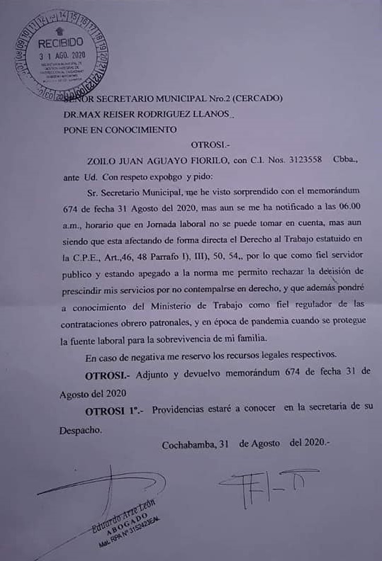 “Sr. Secretario Municipal, me he visto sorprendido con el memorándum 674 de fecha 31 de agosto de 2020, más aún se me ha notificado a las 6:00 a.m., horario que en jornada laboral no se puede tomar en cuenta, más aún siendo que está afectando de forma directa el Derecho al Trabajo”, señala la carta enviada por Aguayo.