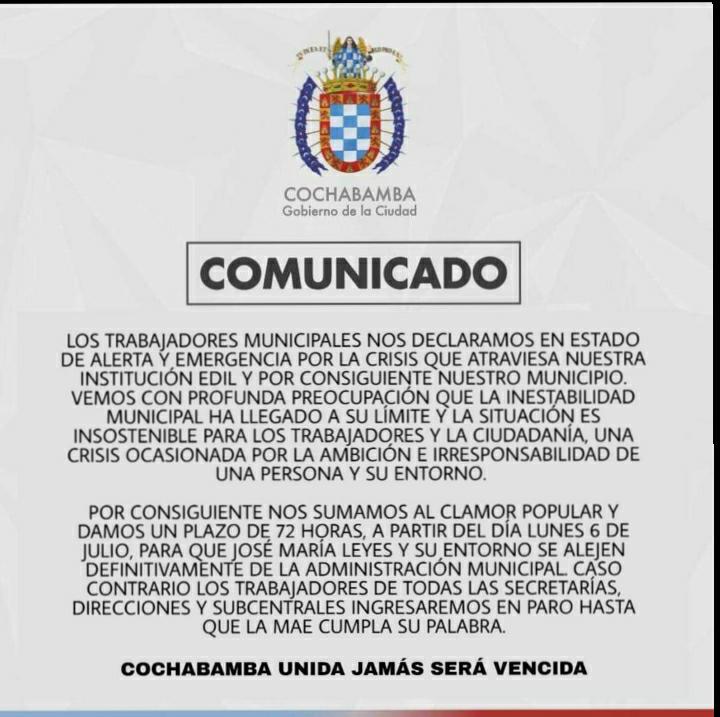 Por otro lado, se tiene al Sindicato de Trabajadores Administrativos del municipio, que denunciaron en reiteradas ocasiones, que no se les dotó de las medidas de bioseguridad, por lo que a la fecha murieron dos funcionarios presuntamente por Covid-19 y otra decena dieron positivo.