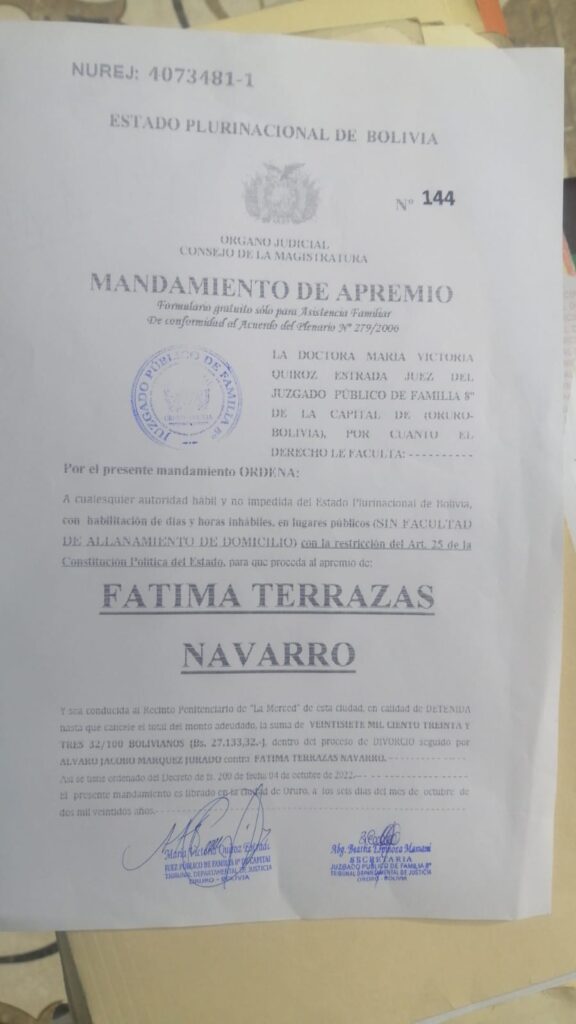 Según señala el mandamiento, su detención corresponde al proceso de divorcio iniciado por su expareja Álvaro M.J. y la activista se mantendría detenida en el recinto carcelario hasta que cancele la suma de 27.133,32 bolivianos, cifra que corresponde a las pensiones que adeudaría para sus dos hijos que habría sido acordada y que, ante la falta de pago de la asistencia familiar, su expareja inicio el proceso de liquidación para que cancele la suma que corresponde hasta la gestión 2021.