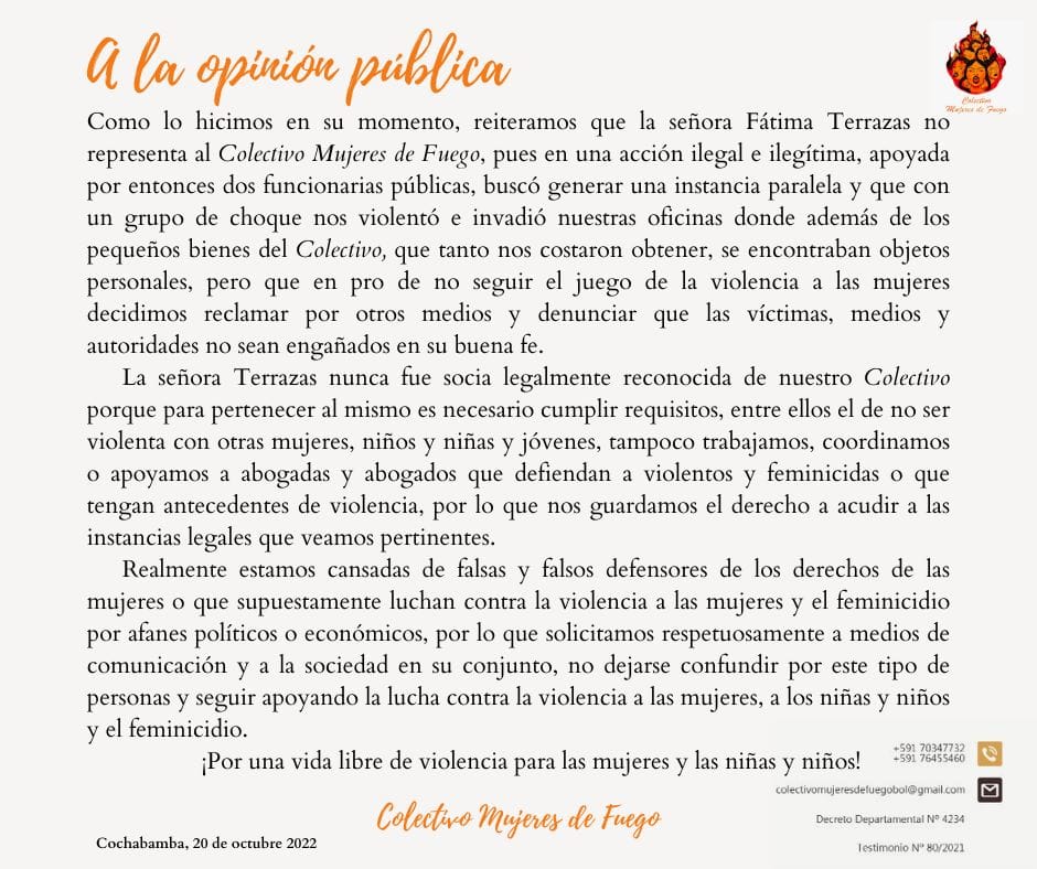 “Como lo hicimos en su momento, reiteramos que la señora Fátima T. no representa al Colectivo Mujeres de Fuego, pues en una acción ilegal e ilegítima, apoyada por entonces dos funcionarias públicas, buscó generar una instancia paralela y que con un grupo de choque nos violentó e invadió nuestras oficinas donde además de los pequeños bienes del Colectivo, que tanto nos costaron obtener, se encontraban objetos personales, pero que en pro de no seguir el juego de la violencia a las mujeres decidimos reclamar por otros medios y denunciar que las víctimas, medios y autoridades no sean engañados en su buena fe”, señala.