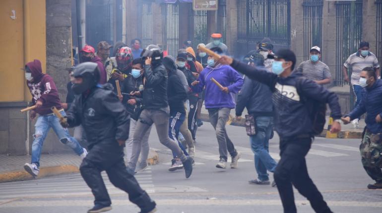 Diferentes grupos que apoyan y rechazan la suspensión del alcalde José María Leyes se enfrentaron ayer en la plaza 14 de Septiembre. La Policía uso gases lacrimógenos para dispersar a los vándalos y arrestaron a más de 10 personas en poder de petardos que eran usados para el combate.