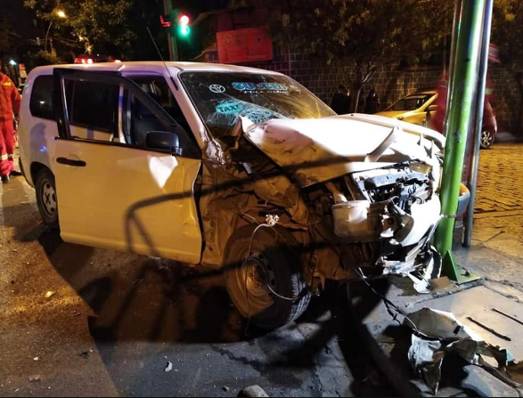 Una imagen difundida muestra que el vehículo que se presume causó el accidente era un taxi. El motorizado habría impactado contra un poste de luz y quedó con la parte frontal y el parabrisas destrozados.