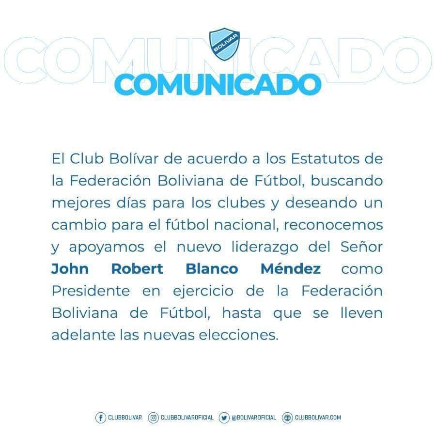 “El club Bolívar de acuerdo a los estatutos de la Federación Boliviana de Fútbol, buscando mejores días para los clubes y deseando un cambio para el fútbol nacional, reconocemos y apoyamos el nuevo liderazgo del señor Jhon Robert Blanco Méndez como presidente en ejercicio de la Federación Boliviana de Fútbol, hasta que se lleven adelante las nuevas elecciones”, señala el comunicado de la academia celeste de La Paz.