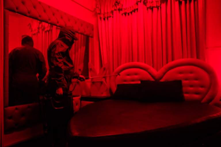 Las meretrices usan mascarillas faciales, barbijos, guantes y trajes transparentes. En las habitaciones se realizan desinfecciones de forma constante.