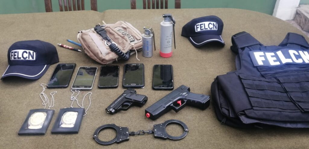 En una previa requisa en el motorizado, encontraron chalecos, gorros, pertenecientes a la Felcn, además de manilas, granadas de gas, agentes químicos, dos armas de fuego de juguete, tres celulares, entre otros objetos.