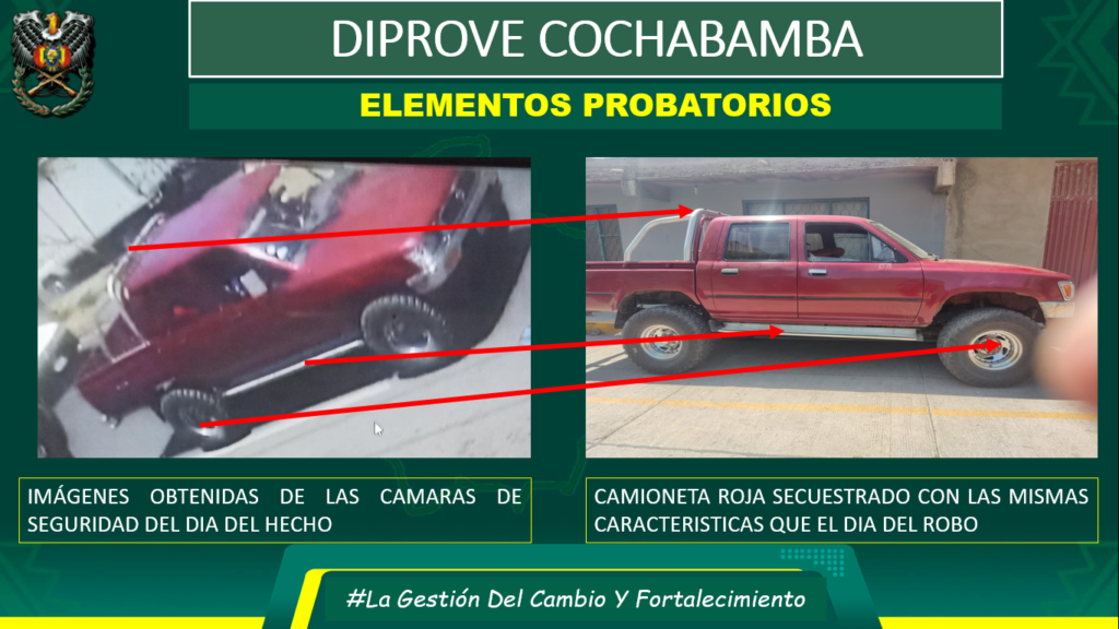 “Dentro el trabajo investigativo que realiza Diprove e inteligencia logra encontrar cámaras de vigilancia donde se ve claramente la camioneta con características especiales y a los sujetos que bajan del vehículo para poder sustraer el mismo”, explicó.