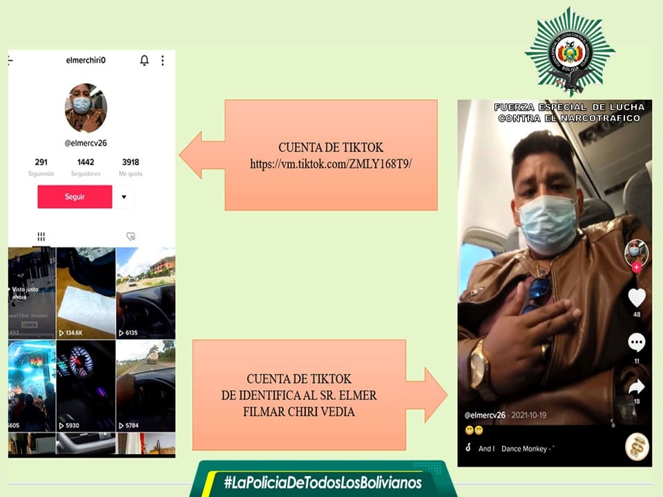 “El 5 de febrero se dio con el paradero de Elmer C. V., quien subió distintos videos de narcotráfico, él habría viajado a Perú, Colombia y Londres, se encontraba en el límite entre Cochabamba y Santa Cruz, al momento de su aprehensión, junto a su hermana; estaban en un vehículo particular marca Chevrolet, para luego ser trasladado al comando Umopar Chapare”, informó el Ministro de Gobierno Eduardo del Castillo.