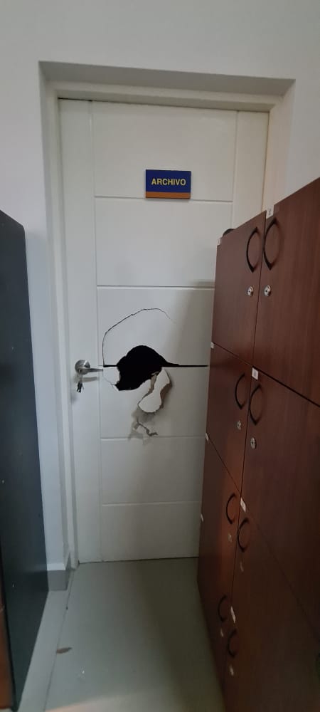 Seguidamente los policías una vez en el vehículo policial realizaron un patrullaje por inmediaciones de las calles Riberalta y Guayaramerin, después de un tiempo prudente tomaron contacto con la responsable de la agencia del Banco Unión ubicada en la zona quien denunció que dos hombres habrían violentado las puertas de la entidad financiera donde habrían sustraído armas de fuego, es así que los dos sujetos detenidos fueron llevados a celdas policiales para su interrogatorio.