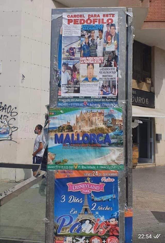 A través de sus redes sociales el periodista español Alejandro Estrambasaguas informó que Barcelona amaneció empapelada con carteles con la frase: “Cárcel para el pedófilo Evo Morales”.
