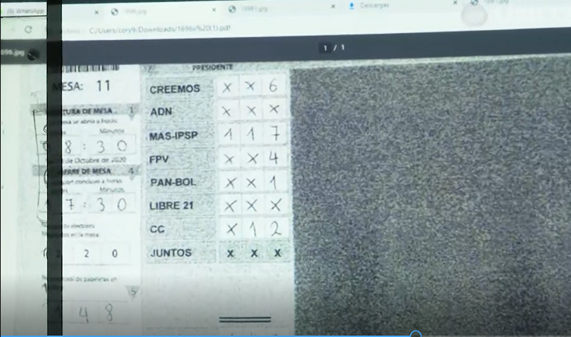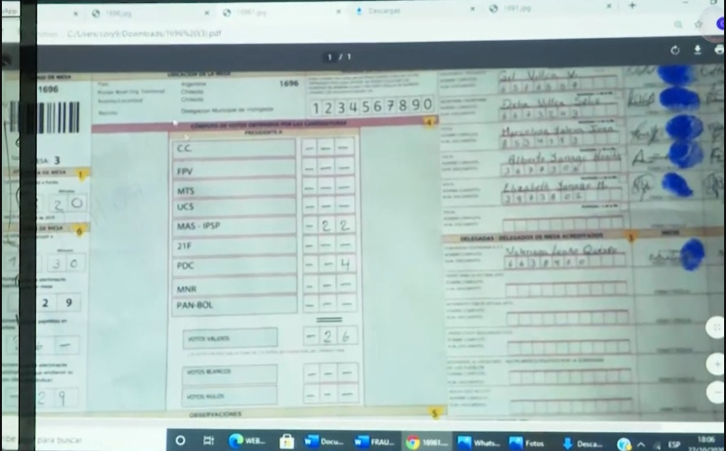 “Acá vemos el acta original de una mesa, la 1996 en Argentina, Chilecito, delegación municipal Ichiasta y el MAS tiene 22 votos. La página carga una imagen distinta, en la misma mesa, 1996, el MAS tendría 117 votos. Esto es lo que queremos esclarecer y seguimos trabajando para ello”, explicó el abogado Jorge Valda.
