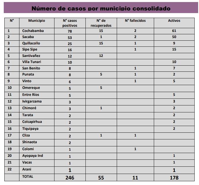 El departamento de Cochabamba registra a la fecha 246 casos positivos de coronavirus, de los cuales 55 pacientes se recuperaron y se lamentó 11 decesos por esta enfermedad.