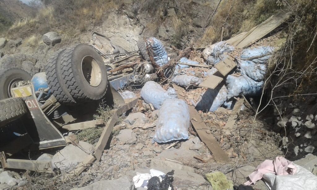 Más de 120 metros el camión se embarrancó, donde cuatro ocupantes del vehículo perdieron la vida de manera instantánea, unos atriccionados entre los fierros, otros salieron expulsados del motorizado y otros fueron aplastados con las cargas de papas.