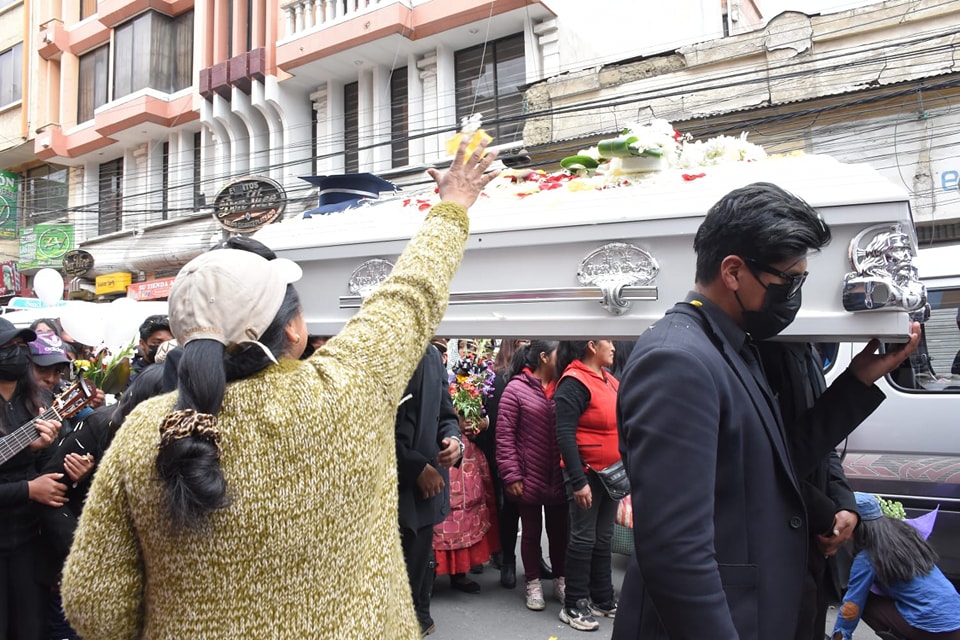 El estudiante de la promoción Miguel Ángel Chocamani fue enterrado la tarde de este martes en el Cementerio General, con una caravana por la zona, llantos y gritos de justicia de sus compañeros de curso y familiares, tras encontrar su cuerpo este lunes en el botadero de Alpacoma.