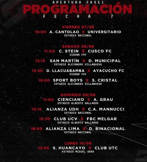 Desde el próximo viernes 7 de agosto, la actividad en la Liga 1 del fútbol peruano regresará. Es más, ya se conoce la programación oficial de los diez partidos que se verán en la séptima jornada del Torneo Apertura.