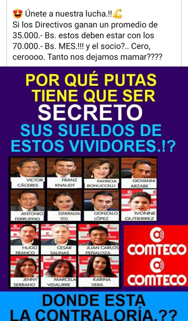 Sin embargo, son numerosas las denuncias que exigen esclarecer cuáles son los sueldos de estas personas que son las que deciden qué hacer la cooperativa. En redes sociales circula que cada uno de estos miembros gana aproximadamente 35.000 bolivianos cada mes; un salario excesivo que no solo pone en tela de juicio el estado económico de la telefónica, sino que crea la susceptibilidad de que realmente exista un grupo de personas que juegan al pasa pasa con estos cargos. Sin embargo, se desconoce cuál es la realidad.
