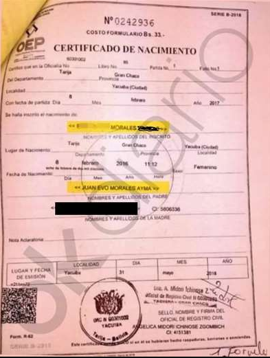 Según el viceministro Melgar, la supuesta hija del exmandatario, que hoy está en calidad de refugiado en Argentina, se llama E.S. Morales V. El certificado de nacimiento, también divulgado por Ok Diario, indica que la bebé nació el 8 de febrero de 2016, en Yacuiba. Fue inscrita en el Registro Civil y ahí se plasman los datos de Juan Evo Morales Ayma.