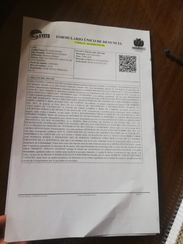 “Yo ya tenía en mis manos la falsedad material en derechos reales, que yo sé quiénes han hecho eso, que son Paola C.A. y Marco F.o. un exjuez registrador que ha tenido sentencia condenatoria y ha pagado su condena en una de las cárceles de Cochabamba por hacer ese tipo de falsedades materiales y cometer irregularidades”, añade.