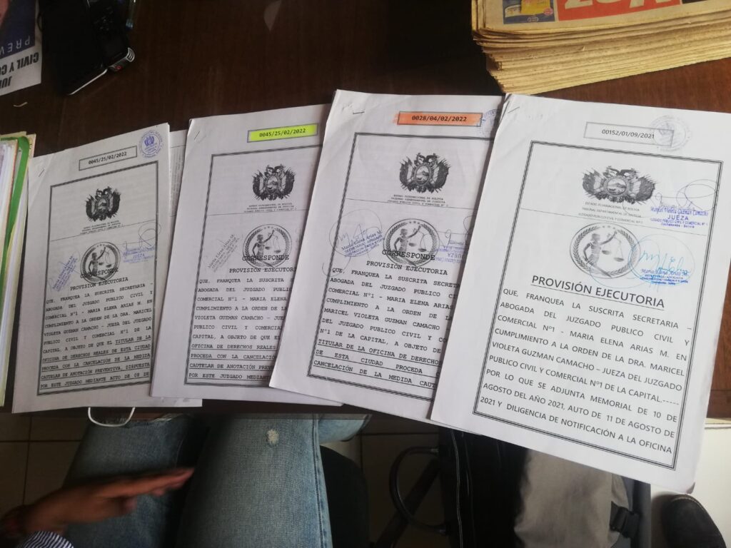 El primero que recibe es una denuncia pela por la ley 348 iniciado por su madre que asegura fue propiciada por sus hermanas, a este le siguió otro proceso de familia, otro por violencia por su hermana alegando daño psicológico por la denuncia en su contra y finalmente un proceso de interdicto de recuperación de procesión.