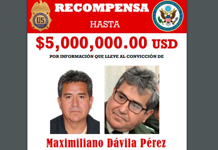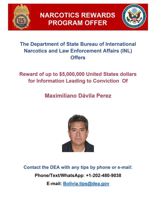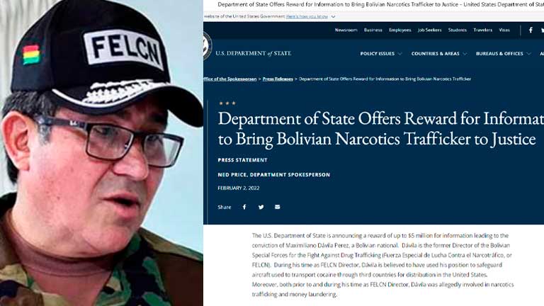 El portavoz del departamento de Estado de Estados Unidos Ned Price informó que su país está ofreciendo una recompensa de $us 5 millones “por información que conduzca a la condena en una corte en Estados Unidos de Maximiliano Dávila Pérez”,  jefe antidroga de la FELCN.