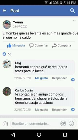 La tarde de este domingo círculo por las redes sociales la noticia que el youtuber Juan Luis Cuevas más conocido como «Chuño Man», es portador de coronavirus y está internado en el Hospital del Norte de la ciudad de EL Alto, en su perfil de Facebook Younn escribió el 21 de julio “El hombre que se levanta es aún más grande que él que no ha caído”, sus seguidores respondieron “hermano espero te recuperes para la lucha”, “ te contagiaron amigo como a los hermanos del chapare, estos de la derecha asesinos”