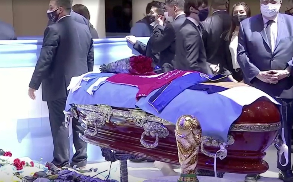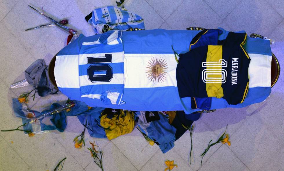 A lo largo del velatorio, desconsolados visitantes arrojaron flores y camisetas de fútbol de diferentes clubes por encima del largo parapeto que los separaba del ataúd cubierto por una bandera argentina.