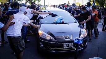 Varios pudieron tocar emocionados el auto cuando la caravana se detuvo unos minutos en medio del tráfico. El velatorio de Maradona transcurrió en la casa de gobierno en Buenos Aires entre muestras de desconsuelo y los desmanes de fanáticos.