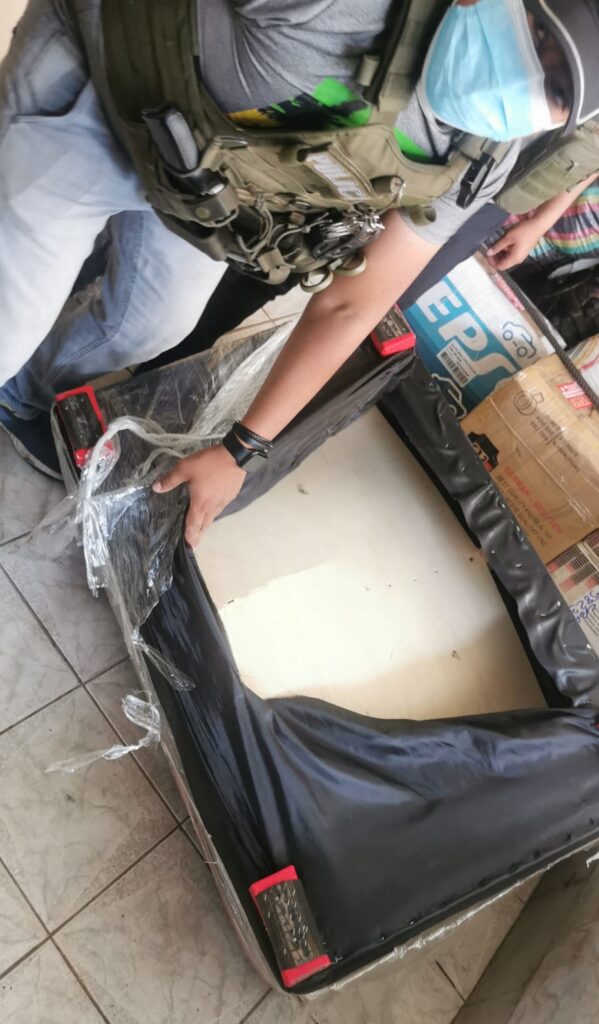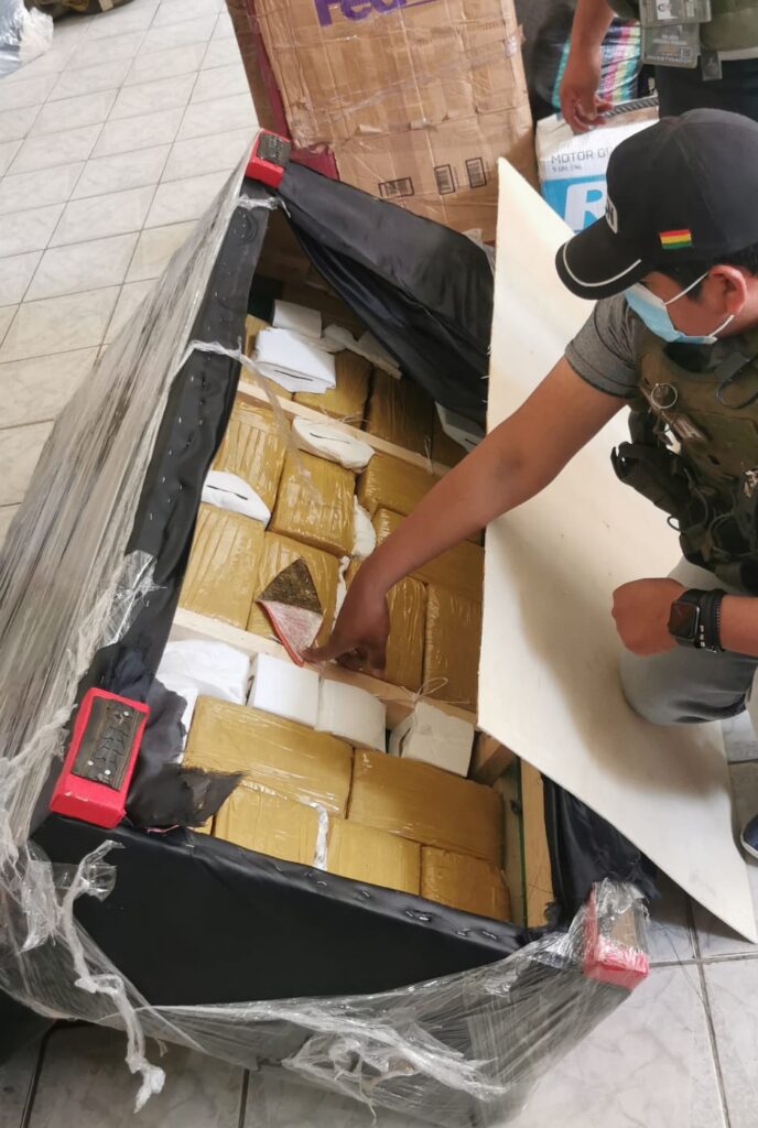 “Es así que realizando diferentes requisas, realizando diferentes registros en bodegas en la misma terminal y en algunas empresas de transporte, se ha procedido a la ubicación de dos sillones, los cuales estaban siendo enviados en calidad de encomienda hasta la población de Trinidad, es así que personal de esta unidad llegan a detectar estos dos sillones que realizando una requisa en estos dos sillones, se llegó a encontrar 34 paquetes de sustancias controladas el cual contenía envueltas en cinta masquín color beige que a la prueba de campo de narco test dio resultado para marihuana”, explicó.