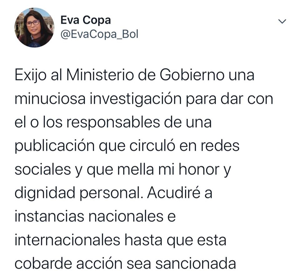 “Exijo al ministro de gobierno Arturo Murillo una minuciosa investigación para dar con el o los responsables de una publicación que circulo en las redes sociales que mella mi honor y dignidad personal. Acudiré a instancias nacionales e internacionales hasta que esta cobarde acción sea sancionada” Afirmo la presidenta del senado en un mensaje en su cuenta oficial de twiter.