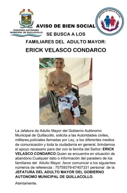 La oficina del adulto mayor del municipio quillacolleño estuvo buscando a familiares de don Erick Velasco, el anciano abandonado, desde mayo de este año, publicando diversos avisos en Facebook y en lugares de concurrencia masiva para lograr dar con el paradero de algún familiar.