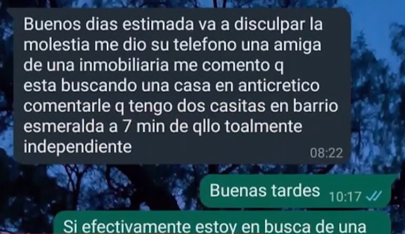 La denuncia fue acompañada con capturas de los mensajes con la denunciada, donde se da cuenta de que ella era la que los contactaba, se ganaba su confianza haciéndoles creer que tenía conocidos en una inmobiliaria que la ayudaban a contactar a las víctimas, prometiendo casas o departamentos totalmente independientes en anticrético. Enviándoles además fotografías de los lugares.