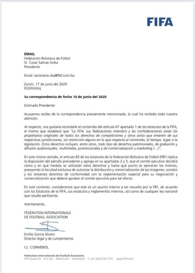 “Nos gustaría recordarle (señores de la FBF) el contenido del artículo 67 apartado 1 de los estatutos de la FIFA, el mismo establece que ‘la FIFA, sus federaciones miembros y sus confederaciones serán los propietarios originales de todos los derechos de competiciones y otros actos que emanen de sus respectivas jurisdicciones, sin restricción alguna en lo que respecta el contenido, el tiempo, lugar o legislación. Estos derechos incluyen, entre otros, todo tipo de derechos patrimoniales, de grabación y difusión audiovisuales, multimedia, promocionales y comercialización y marketing (…)”, señala parte del comunicado, donde FIFA además aclara que el Comité Ejecutivo de cada federación, en este caso la boliviana, son los únicos autorizados en decidir la venta de esos derechos, incluido el televisivo de la División Profesional.