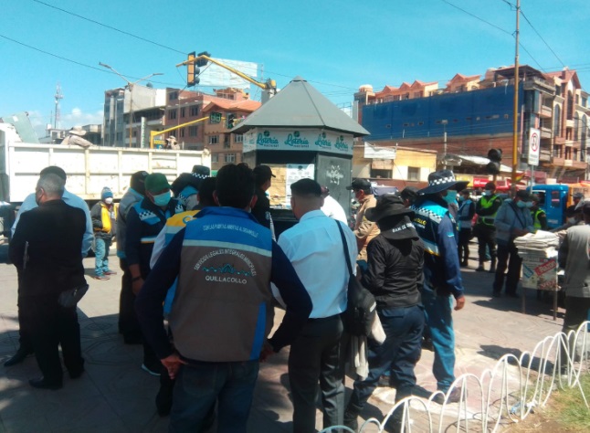 En un operativo de control, funcionarios de la Alcaldía de Quillacollo retiraron al menos dos quioscos, uno de venta de periódicos que estaban instalados en la avenida de la Integración en inmediaciones de la Plaza Bolívar, en pleno centro de Quillacollo.