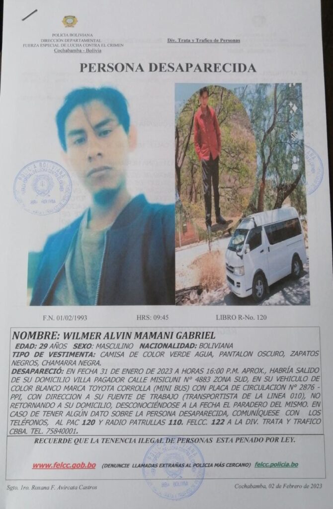 Wilmer, desapareció el 31 de enero junto con su trufi, el motorizado fue encontrado en el trópico de Cochabamba y por su desaparición seis personas fueron aprehendidas.