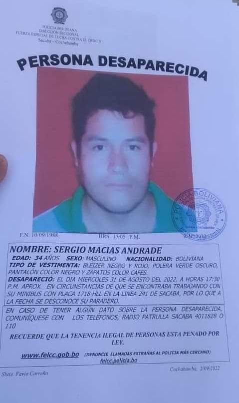 En el caso de Sergio Macías, su familia dio a conocer que desapareció el 31 de agosto del año pasado, cuando se encontraba trabajando con su trufi en la ruta de Sacaba – Cercado y desde entonces no volvieron a saber nada de él, por lo que presumen que los restos podrían ser suyos.