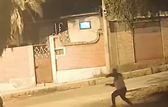 Según los vecinos, su comportamiento es errático, agresivo y fue captado por cámaras de seguridad cuando de la nada empezó a lanzar piedras a una vivienda destrozando ventanas y parte del mobiliario.