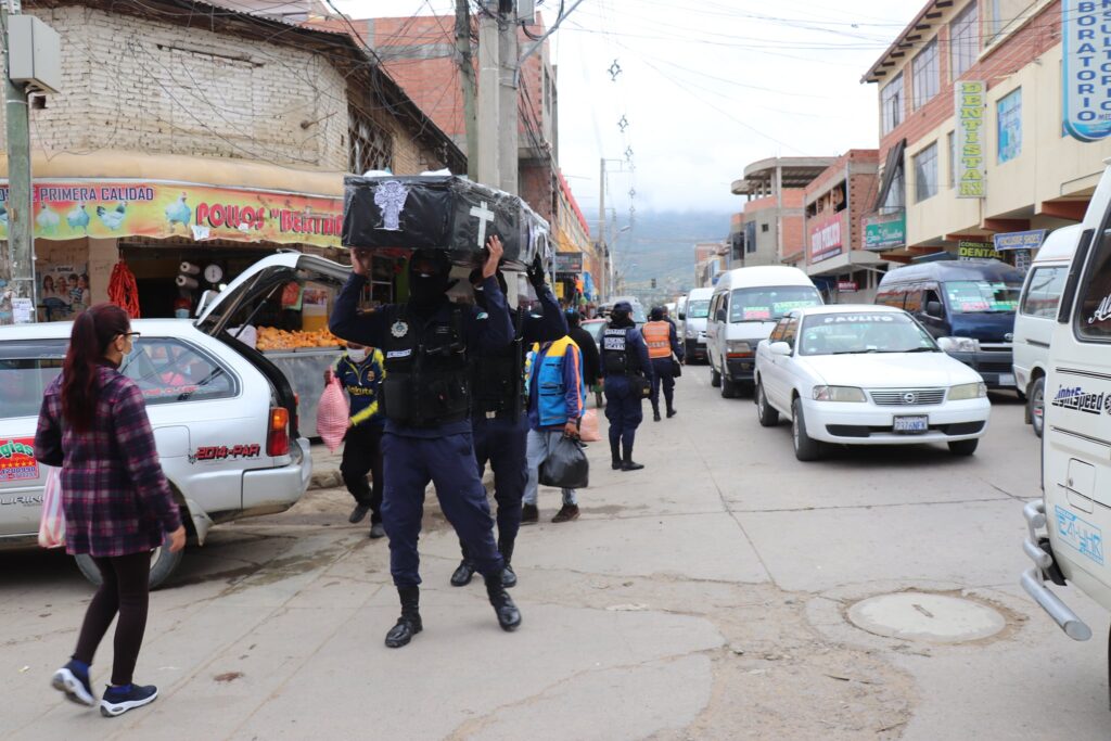 Los operativos que se realizan incluyen la concientización a la población, guardias municipales cargan un ataúd dando el mensaje de los riesgos que trae consigo contagiarse de covid-19.