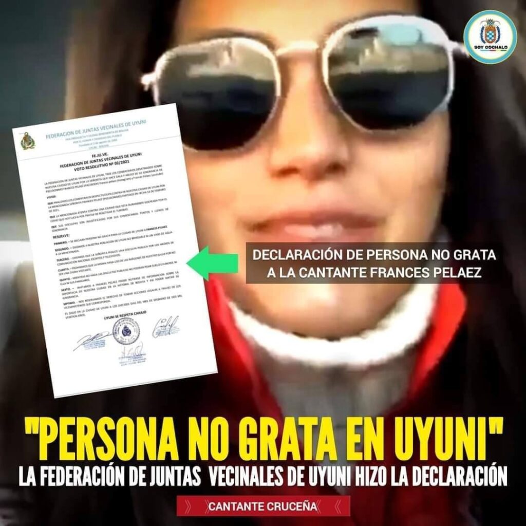 Frances Pelaez, cantante cruceña, causó molestia no solo de los pobladores de Uyuni, sino también de los internautas luego de que circulara un video en el que califica a Uyuni como un lugar feo.