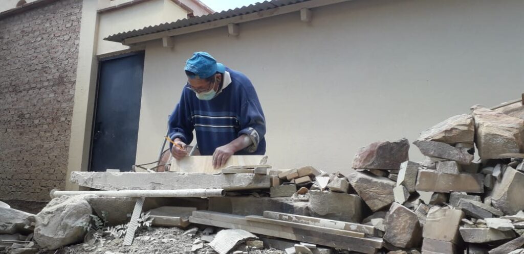 Rolando Achacollo Cruz, trabaja hace 20 años tallando piedra empezó como ayudante y una vez que aprendió el oficio decidió independizarse. Actualmente elabora lápidas, bancas, chimeneas, escaleras, batanes entre otros.