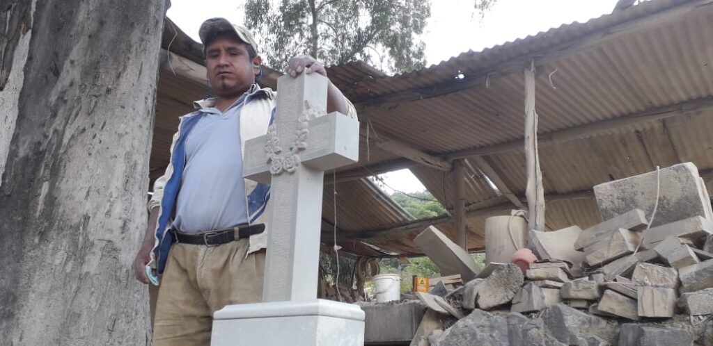 Una cruz en piedra con unas flores talladas minuciosamente son la muestra de la habilidad que tiene Rolando para moldear la piedra; sin embargo, señaló que no quisiera que sus hijos se dediquen a esta actividad, pues aseveró que es un trabajo “muy duro”.