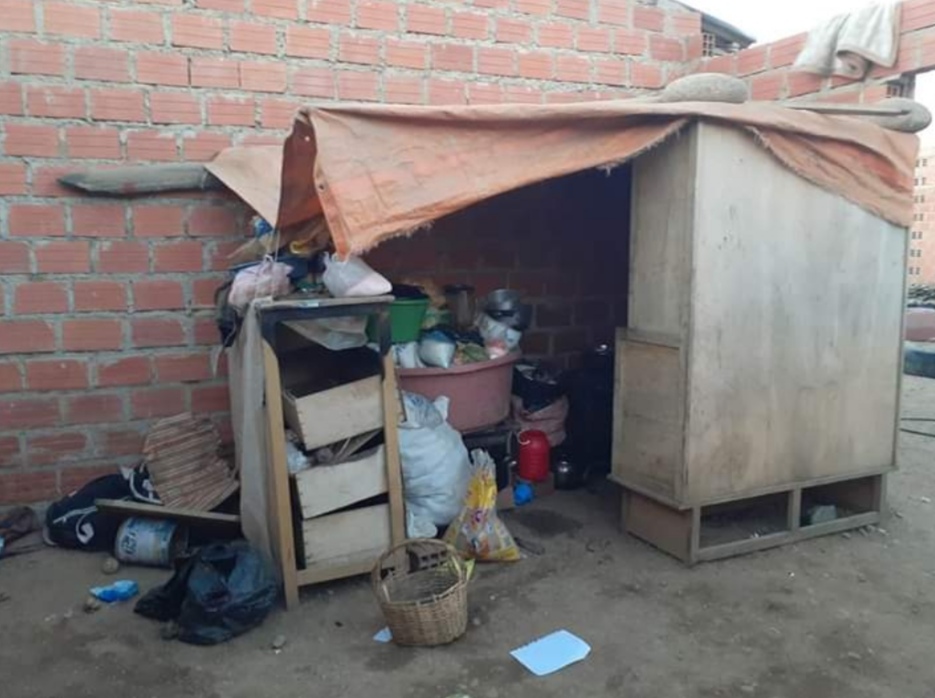 La familia habita un pequeño cuarto, en una vivienda que cuidan hace mucho tiempo. En el patio de tierra, improvisaron una cocineta con maderas y plásticos. Desde que enfermó Marina y el inicio de la cuarentena, la situación de la familia es dramática, viven de la caridad de sus vecinos y algunos días no tienen con qué alimentarse.