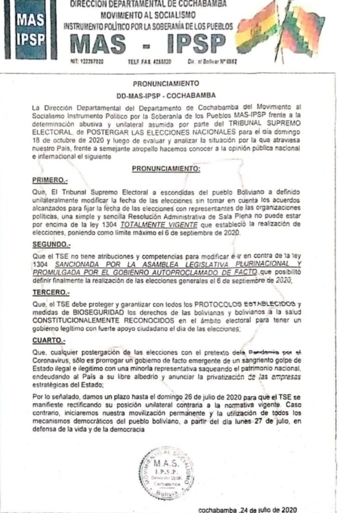 Mediante un pronunciamiento, la dirección departamental de Cochabamba, del Movimiento Al Socialismo (MAS) da un plazo hasta el domingo 26 de julio para que el Tribunal Supremo Electoral (TSE) se retracte con respecto a la postergación de los comicios. Amenazan con movilizaciones desde este lunes 27 de julio.