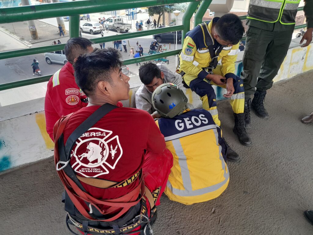 Equipos de rescate de GEOS, bomberos de la policía y ambulancias se desplegaron en el lugar donde incluso se armó un colchón inflable en caso de que no se pudiese evitar que salte.