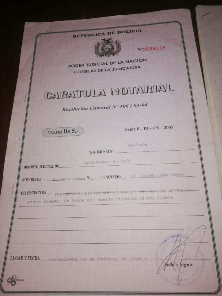 Martín Reynaldo Olmos Llanos, explicó que en la gestión 2006 atrás su padre le entregó la vivienda como herencia al no haberse hecho cargo de su él desde que nació. “Me dice, esto, es lo único que voy a hacer por voz en mi vida, no me pidas nada más… Entonces lo que voy a hacer es dejarte esta casa”, explica.